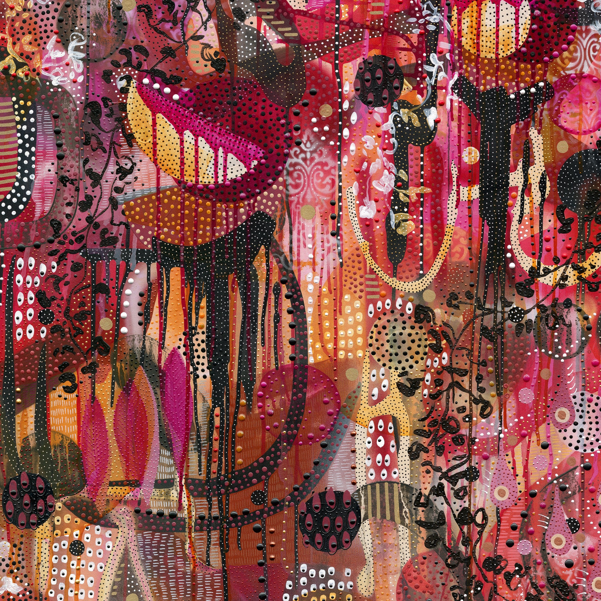 Through layers of paint and pattern, I let feelings guide the forms. Flowers, drips, and dots mix like thoughts before coffee—half-formed but full of energy.