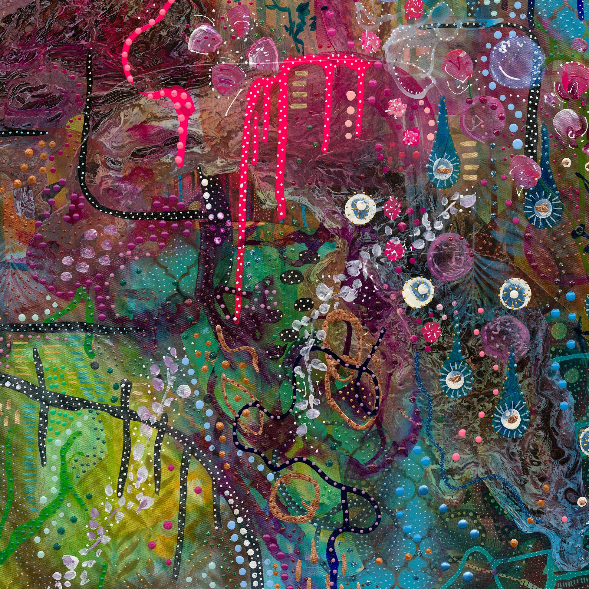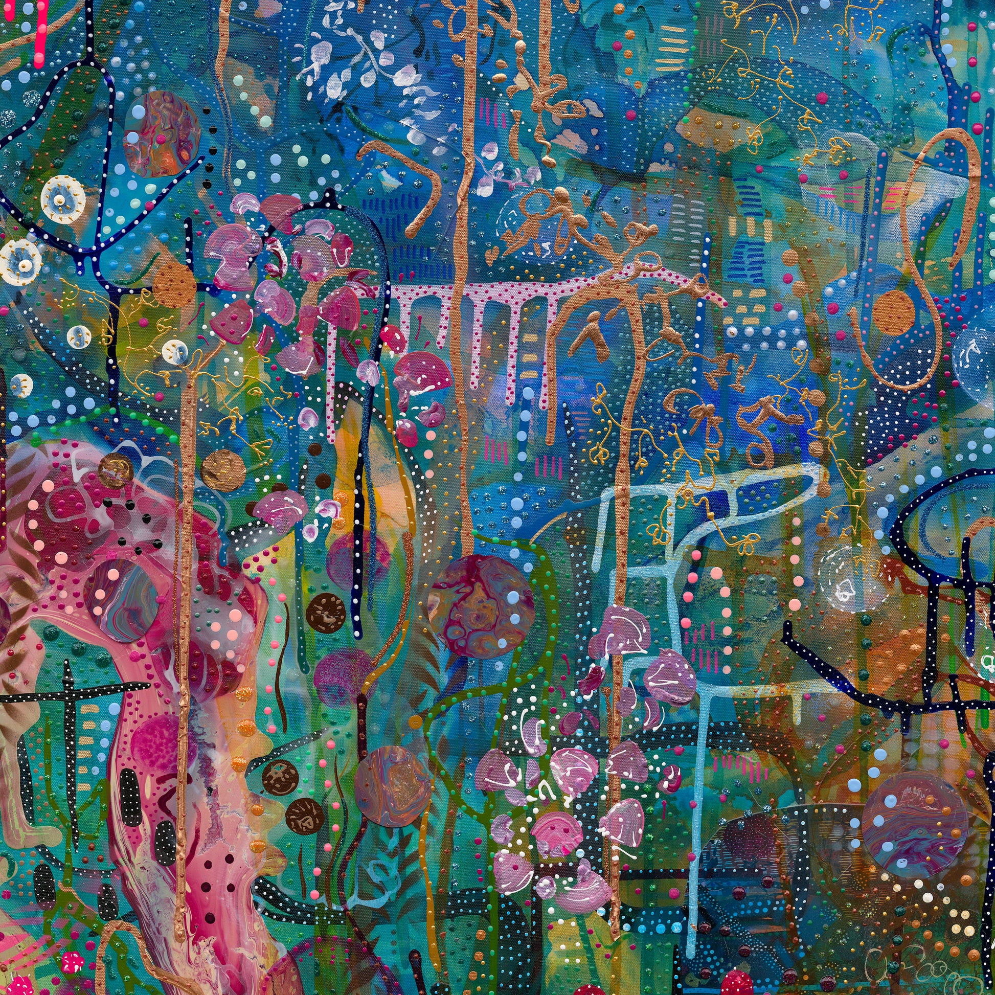 Through textured layers, rhythmic trails of colour, and dreamlike traces, the artwork reveals what is often overlooked—tiny movements, shifting shadows, delicate rhythms. Like a caterpillar inching across a leaf or a cloud drifting overhead, it reminds us that wonder lives in stillness, and stories bloom when we slow down enough to see them.