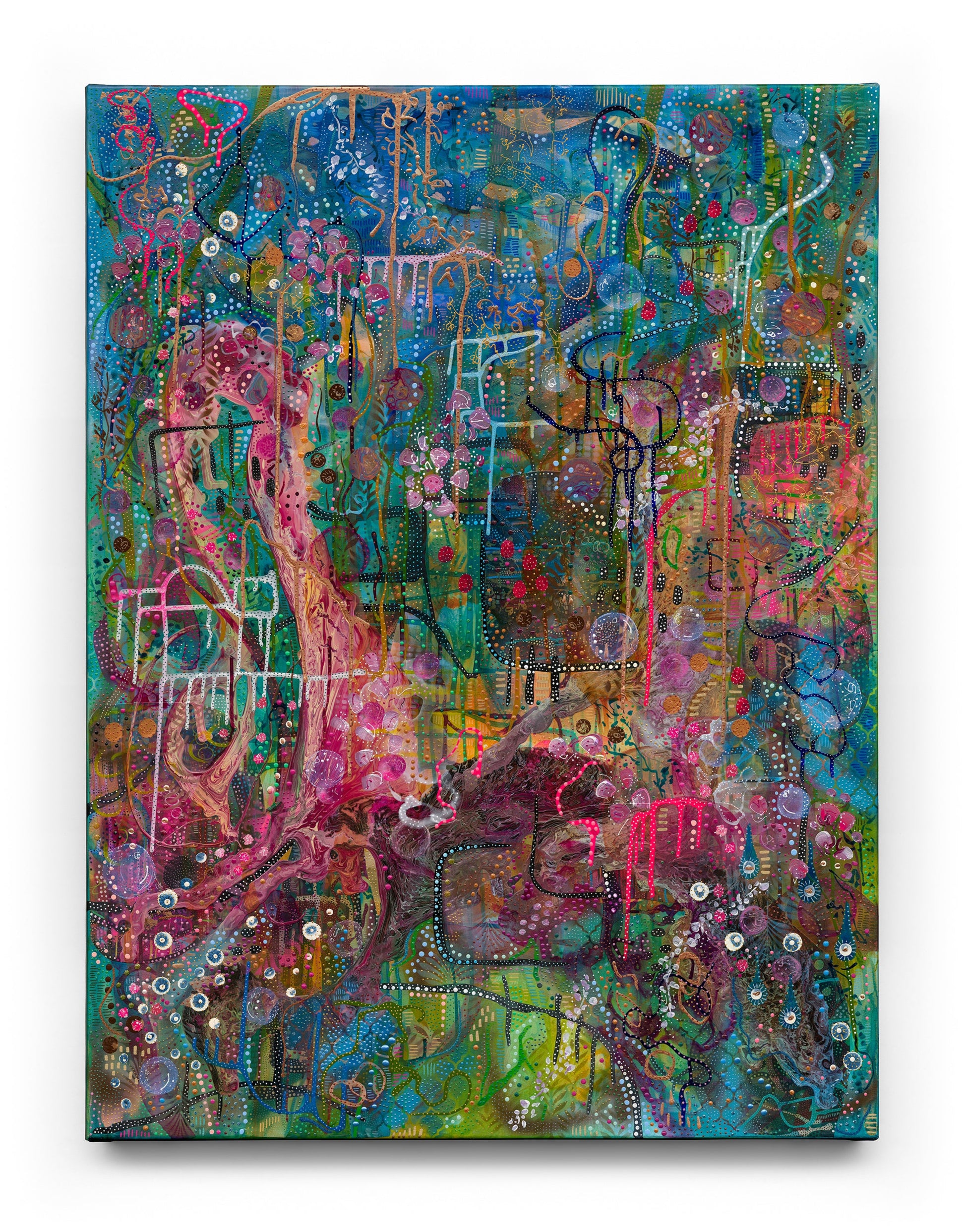 "Conversations with Clouds and Caterpillars" invites the viewer into a landscape where memory and imagination grow together like vines. In this layered world, colour becomes a conversation, and the marks move like whispers—slow, thoughtful, and quietly alive.
