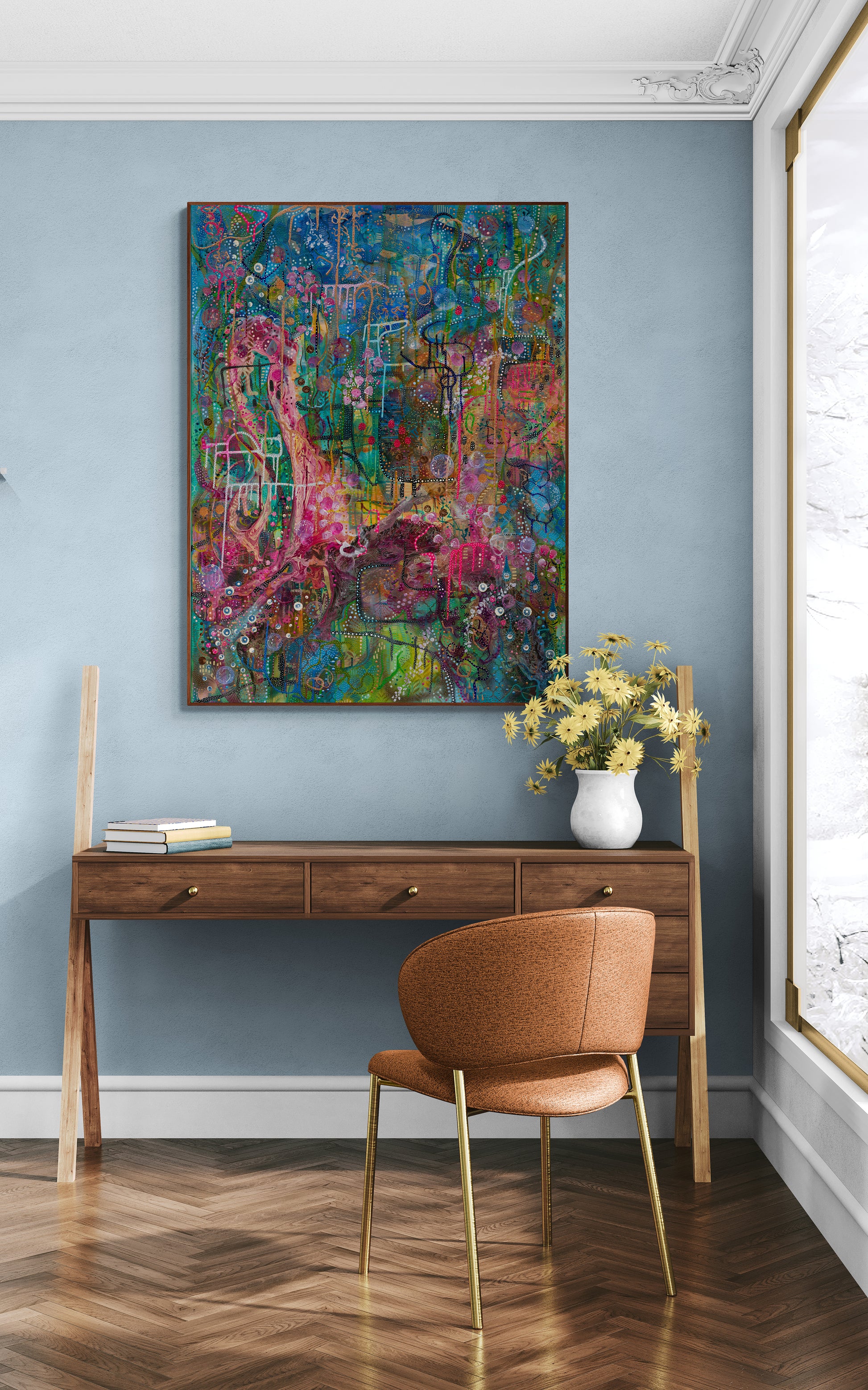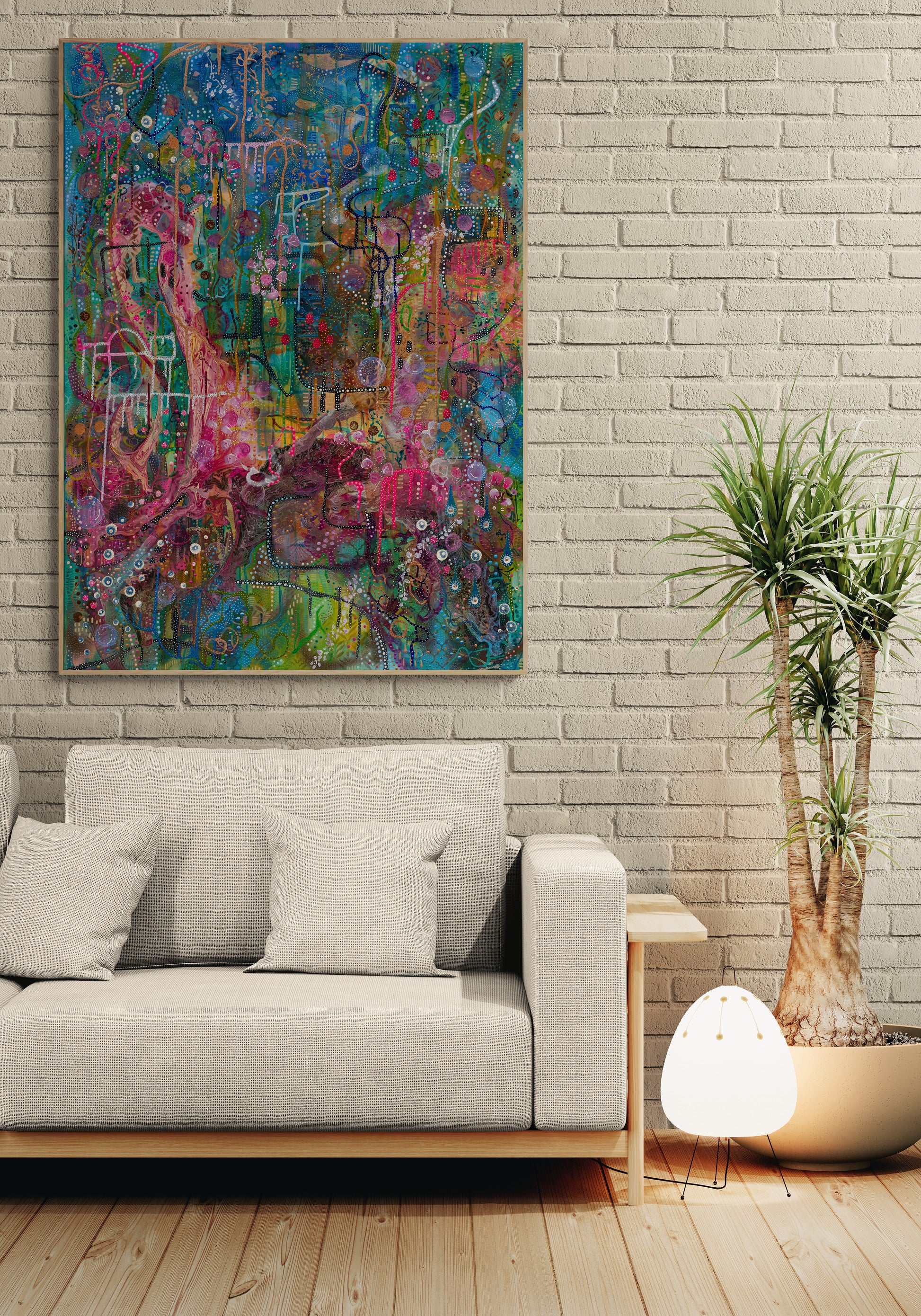 "Conversations with Clouds and Caterpillars" comes professionally framed in your choice of Oak, Black, or White float frame—each thoughtfully selected to enhance the artwork’s detail and colour. This high-quality framing is included in the price, offering a polished, gallery-style finish with lasting protection. Whether you're a collector or simply seeking a statement piece, your artwork will arrive ready to hang and enjoy.