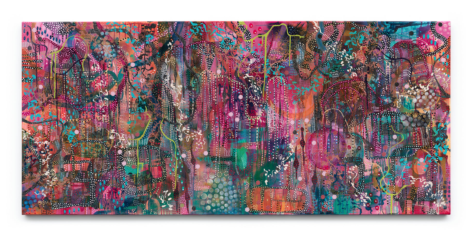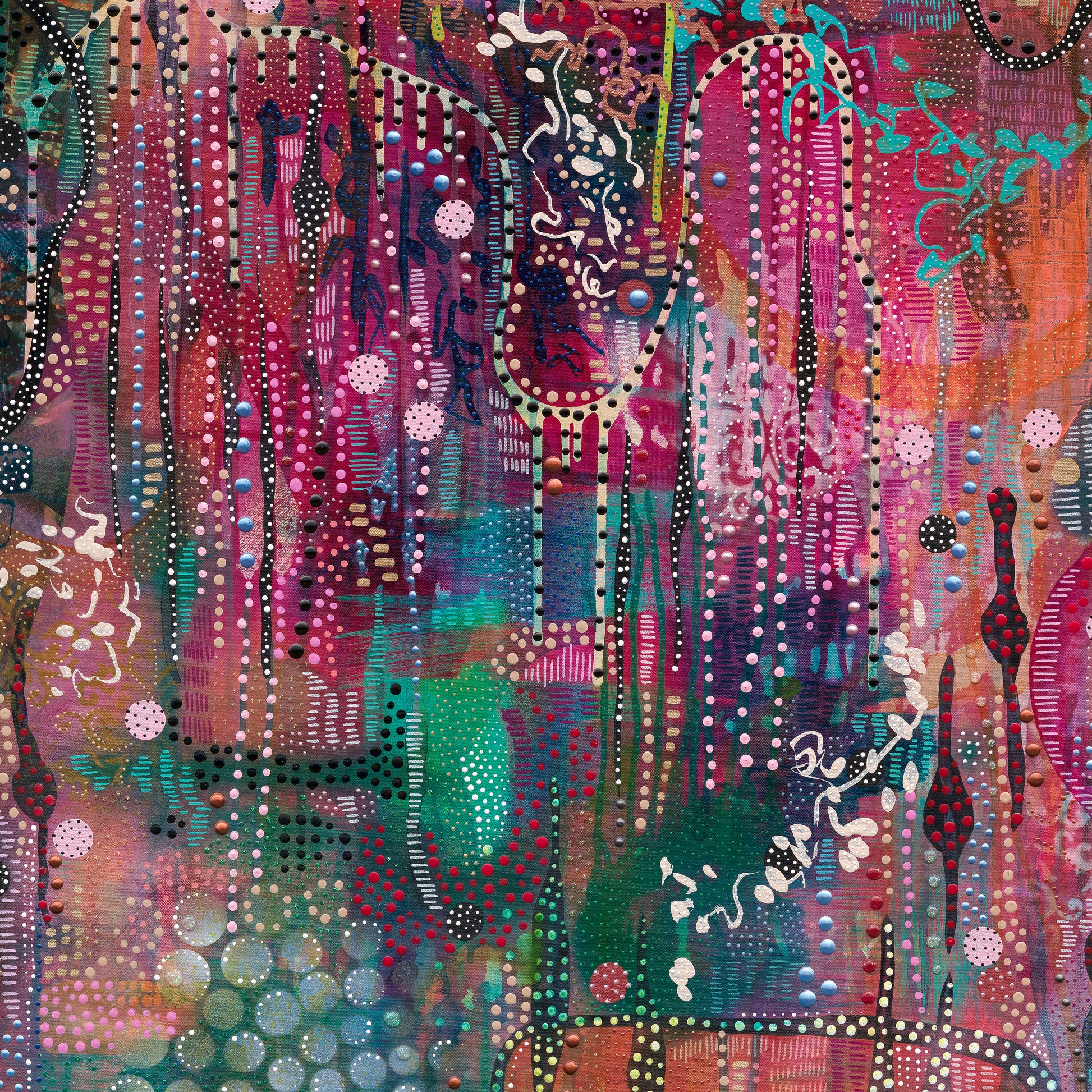 Colours swirl like dreams—pinks, blues, and greens dancing through the air. Bubbles float gently, and tiny dots sparkle like stars, all whispering hush-hush stories.