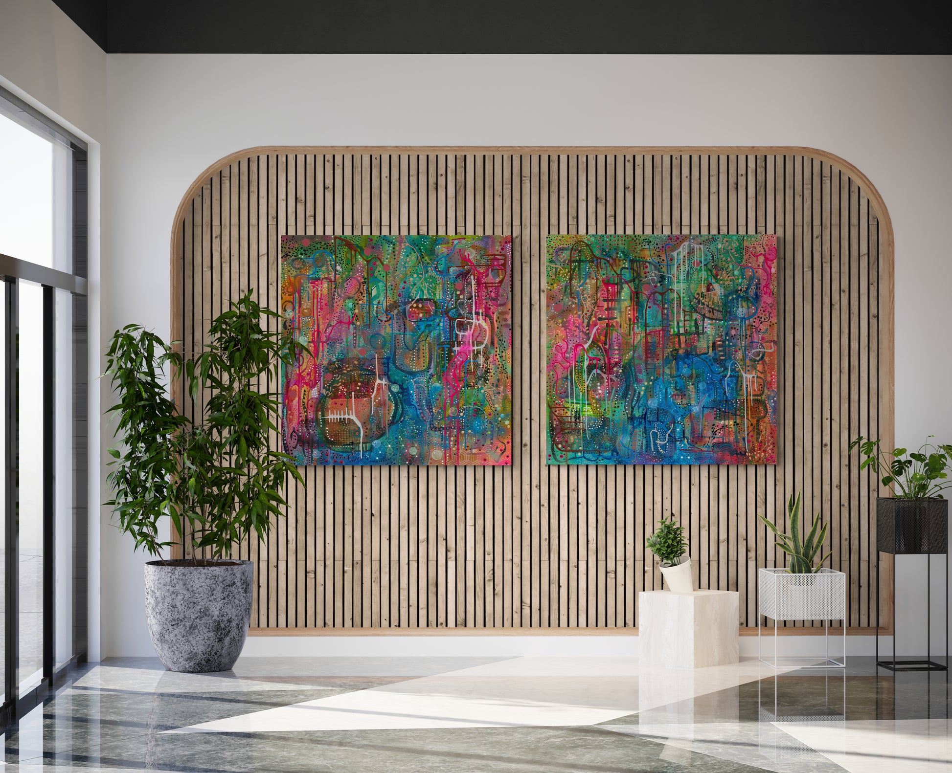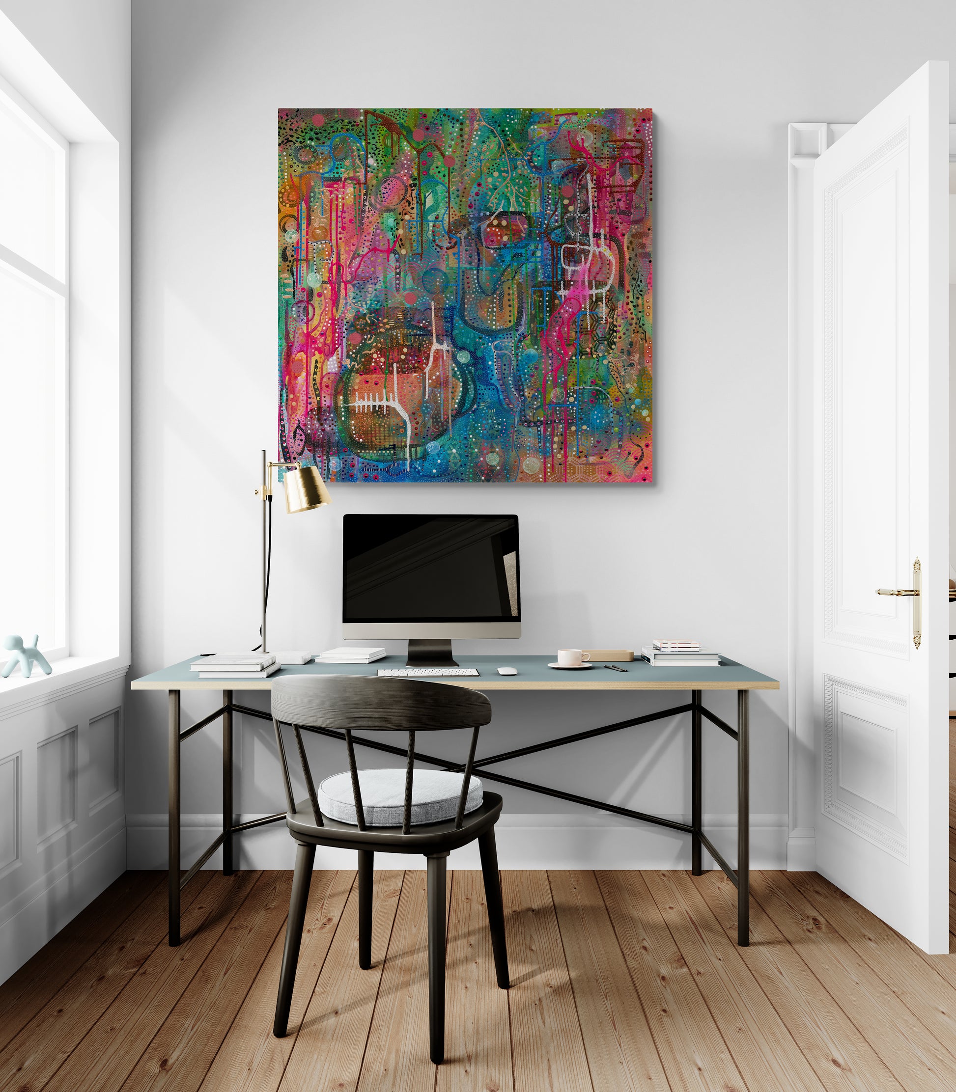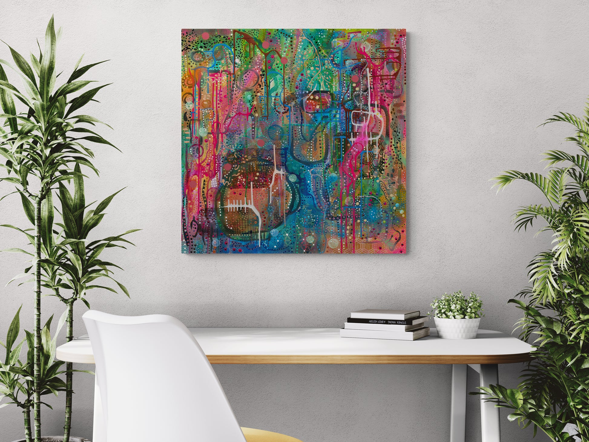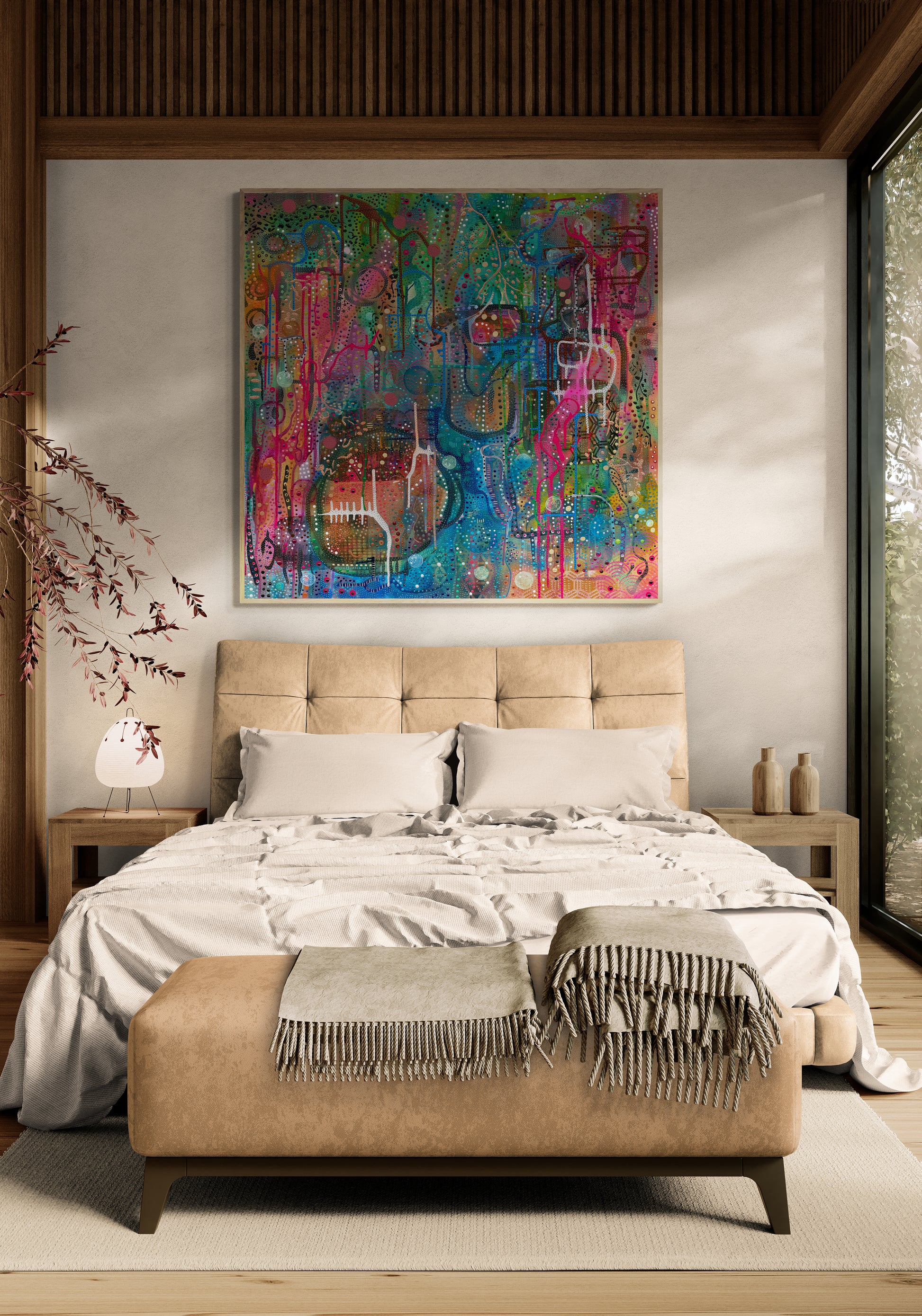 Lush textures and playful patterns bloom across the canvas, echoing the feeling of lying under the gum trees, watching the light dance through the branches. A perfect partner to “Bush Babies”, this piece captures a world where imagination blossoms, and nature sings in soft, enchanted tones.